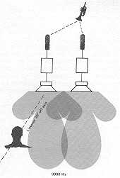 What we actually do with these little bookshelf loudspeakers, for example, is to start off with a 12" diameter loudspeaker and right away that gets you into a semantic problem. You find out that the loudspeaker manufacturers lie a little bit just like the guys who make cereal boxes. They don't fill the box all full of cereal and they don't fill the loudspeaker all full of active radiator. It turns out that a 12" diameter loudspeaker is simply a direction that tells a man to cut a hole 12" in diameter in order to mount the loudspeaker. What you really get is about 10" of active cone. The 10" of active cone start radiating at 20 cycles and radiate to 250 cycles, where a wavelength is about 4 feet. Then that loudspeaker starts to roll off out of the picture both acoustically and electrically and we then start radiating from an 8" loudspeaker, which only has a 5" diameter cone and that radiates from 4 feet, 250 cycles to 1500 cycles where a wavelength is only about 8". The radiation pattern then becomes approximately what you see over here. At that point we move out of the 8" speaker into an inch and a half diameter dome radiator. The dome shape gives the radiator a particularly strong structure for a very light mass. That radiator starts at 1500 cycles, 8" wavelength, and radiates to 7000 cycles where the wavelength is about 1-3/4". Then we go out of that into a compound coaxial radiator. The outside ring or annulus can radiate from 7000 cycles to 14 kilocycles and the inner ring, which is a 1/2 inch diameter button, can continue to radiate to 20,000 cycles where a wavelength is about 6/10ths of an inch.